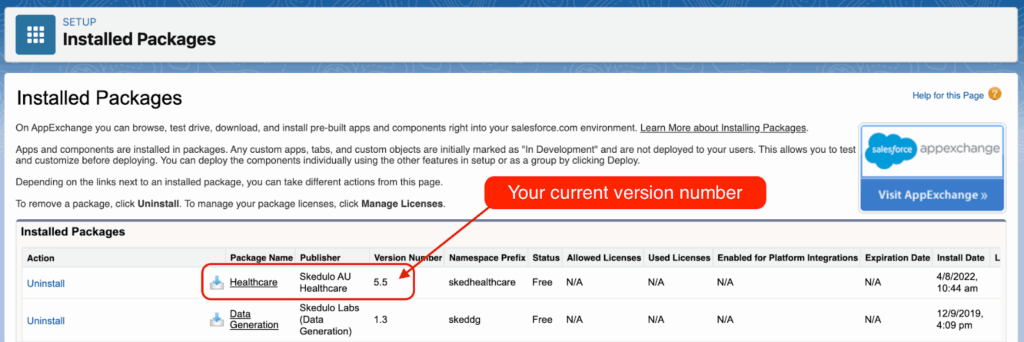 Before initiating a package update, it’s important to confirm which version of Skedulo for Healthcare is currently installed in your org.