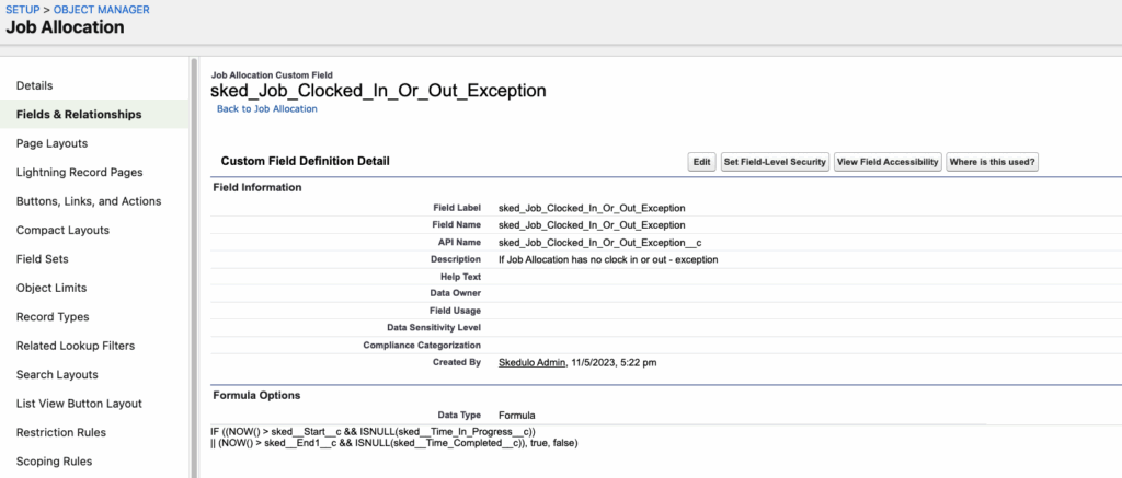 When a Job Allocation record meets the logic defined in the formula, the Checkbox field on that record will automatically be marked as ‘True’ (checked), indicating that an exception has occurred.