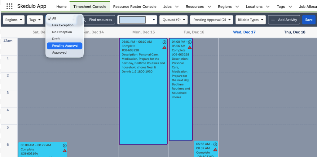 Jobs or Shifts can be filtered by their Approval Status.